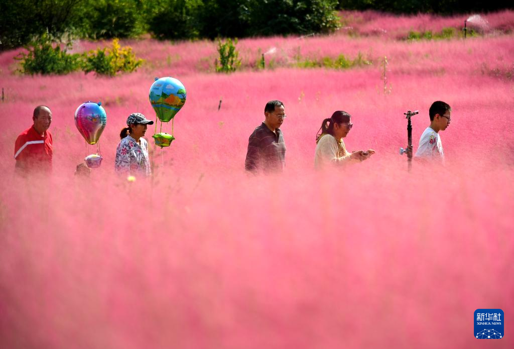 10月3日,游客在山东省枣庄市凤鸣公园粉黛花海游览。