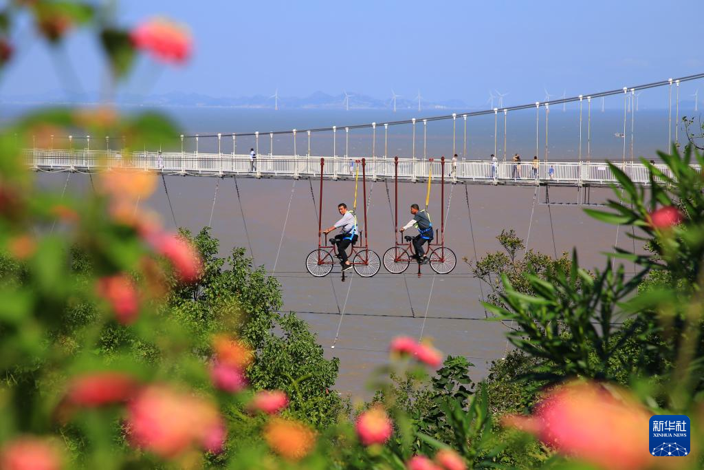 10月3日,在浙江省玉环市干江镇滨海旅游带,游客体验高空骑车。