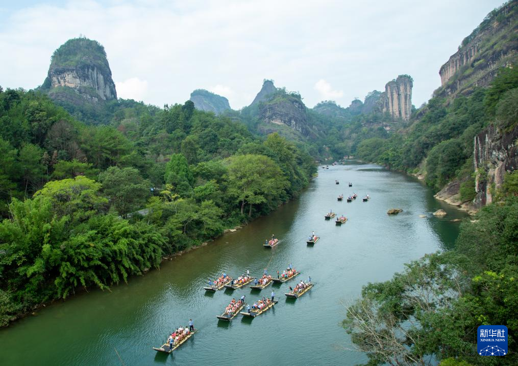 10月3日,游客在福建省武夷山国家公园九曲溪乘船游览。