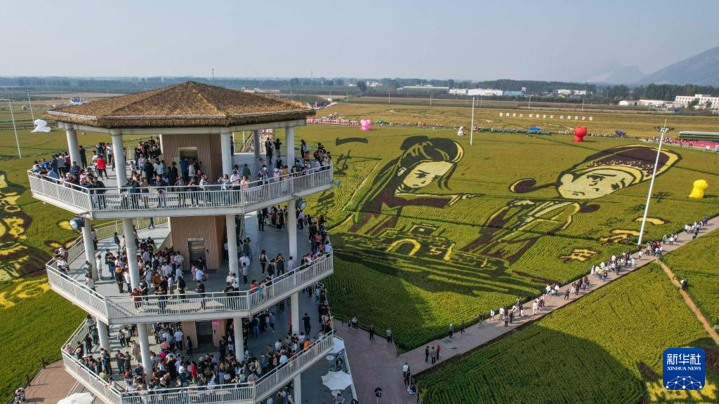 10月3日,游客在河北省遵化市一景区观景台观赏稻田画(无人机照片)。