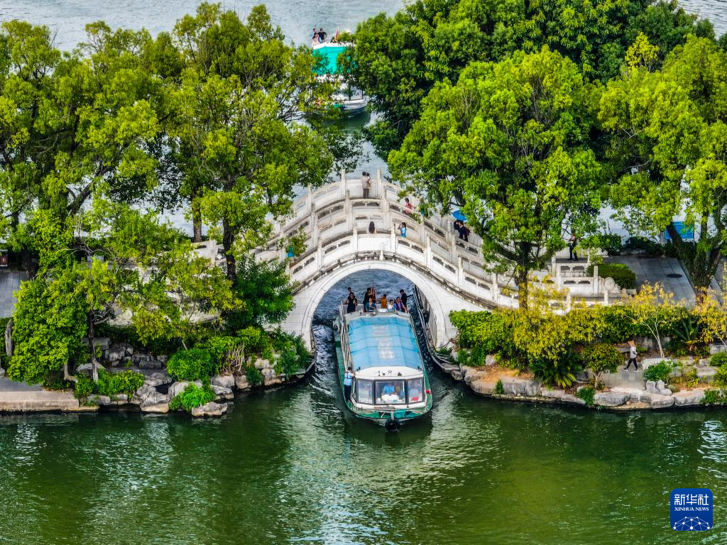 10月3日,游客在广西桂林市榕湖乘船游览。
