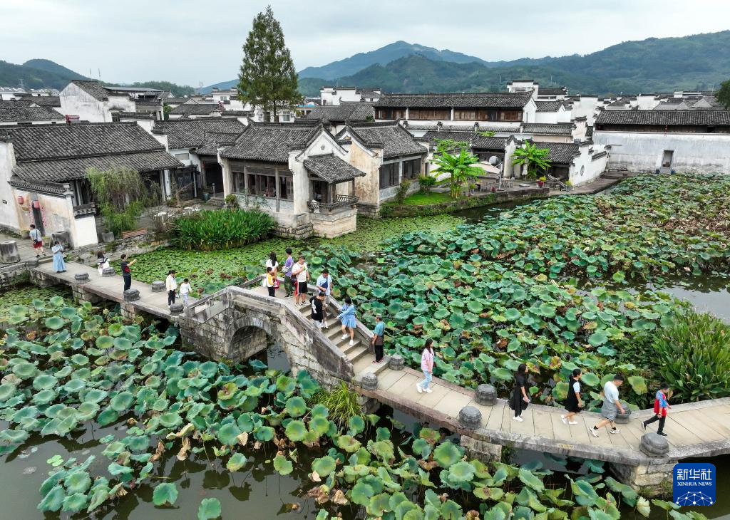 10月3日,游客在安徽省黄山市徽州区呈坎古村落游玩(无人机照片)。