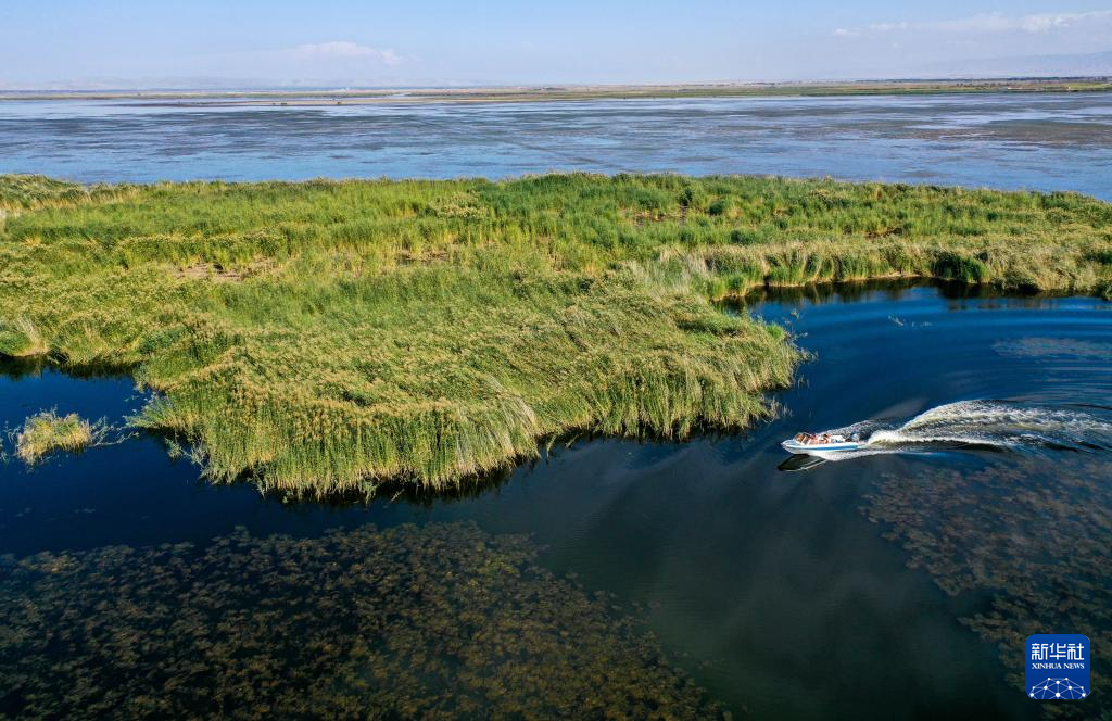 9月15日,在乌梁素海湖面上,武蓉、冯琛和刘莹慧乘坐快艇去采集湖水样本(无人机照片)。