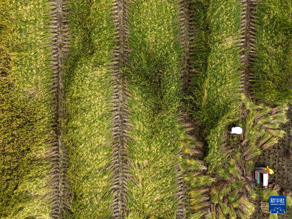 10月12日,农户在浙江省乐清市白石街道密川村田间收割稻谷(无人机照片)。