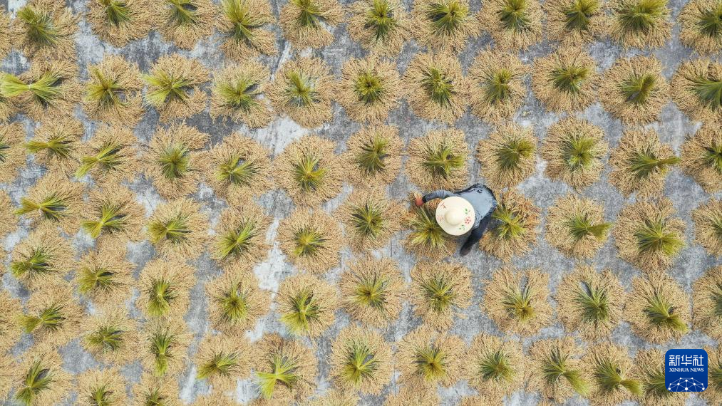 10月12日,村民在贵州省黔东南苗族侗族自治州从江县刚边壮族乡刚边村晾晒糯稻(无人机照片)。