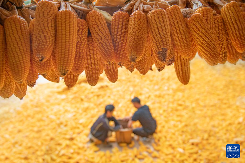 10月12日,云南省文山壮族苗族自治州文山市追栗街镇的农民晾晒收获的玉米。