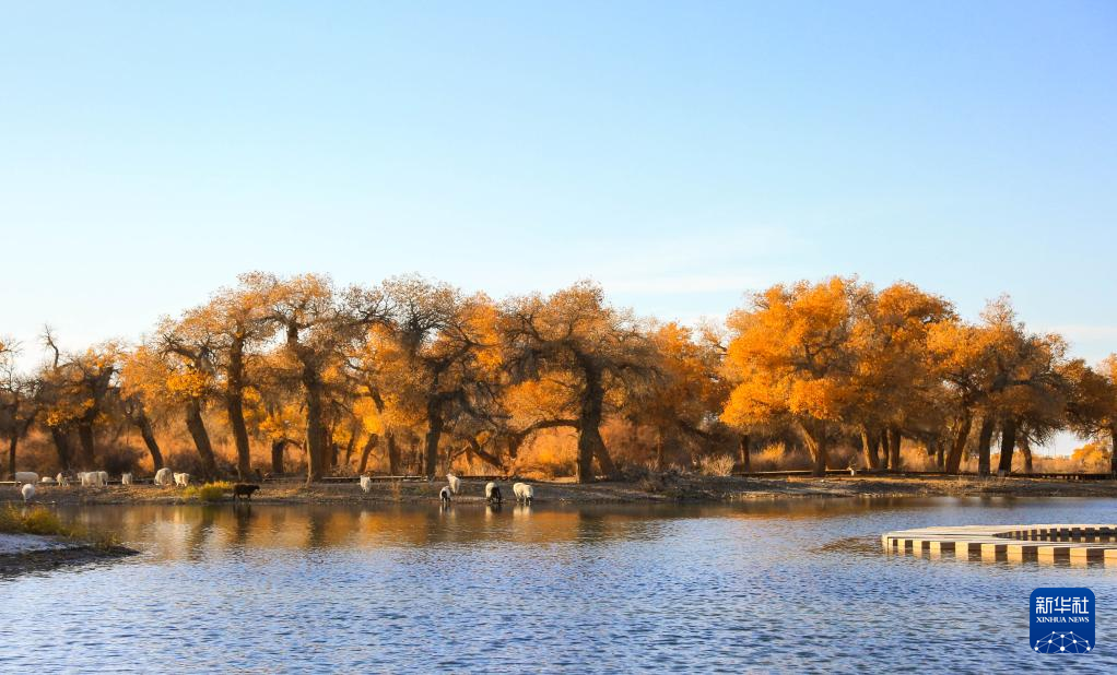 10月24日,羊群在胡杨林前饮水。