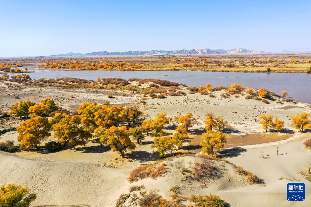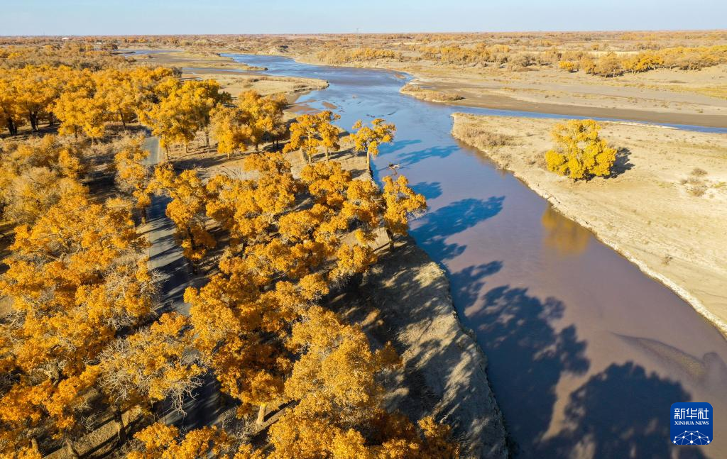 这是黑河岸边的胡杨林(10月24日摄,无人机照片)。