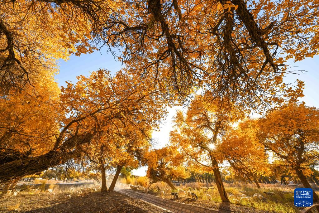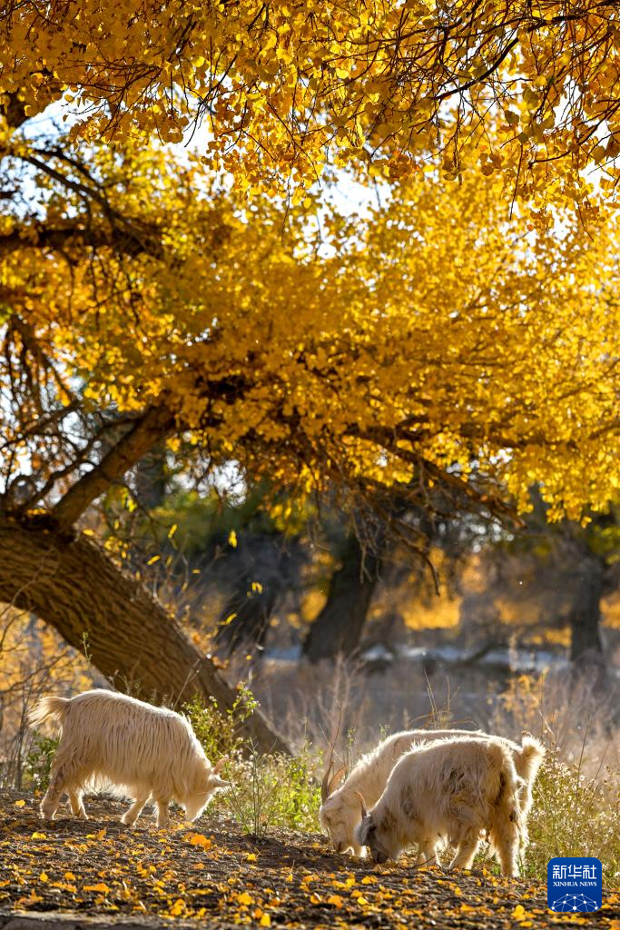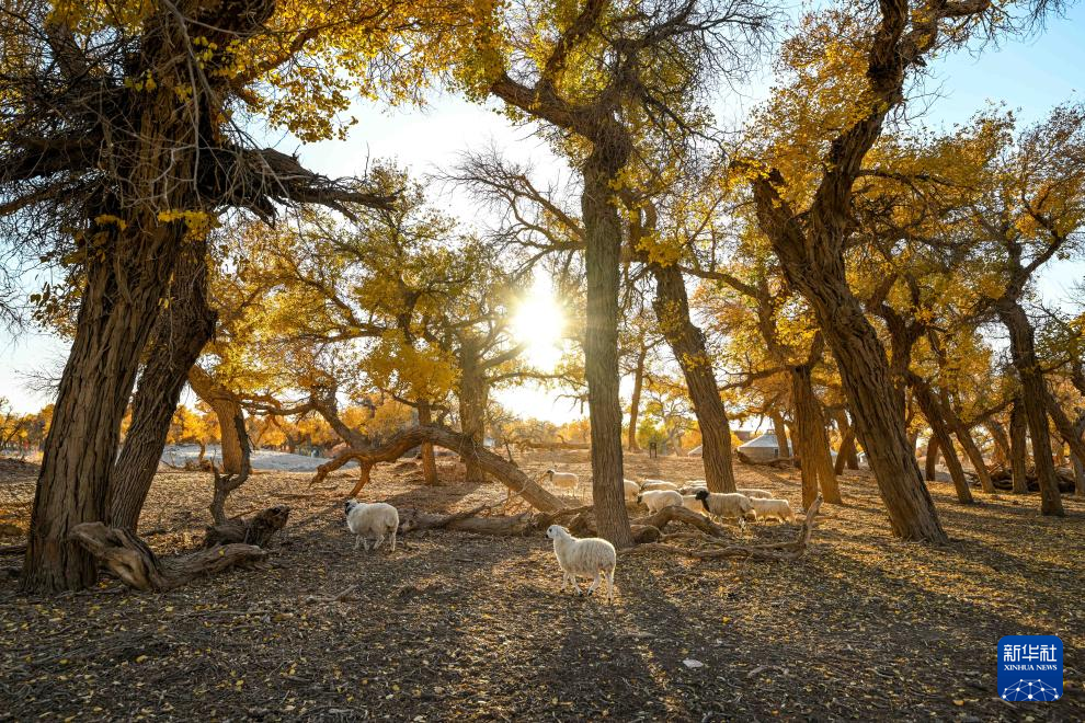 10月24日,羊群在胡杨林里觅食。