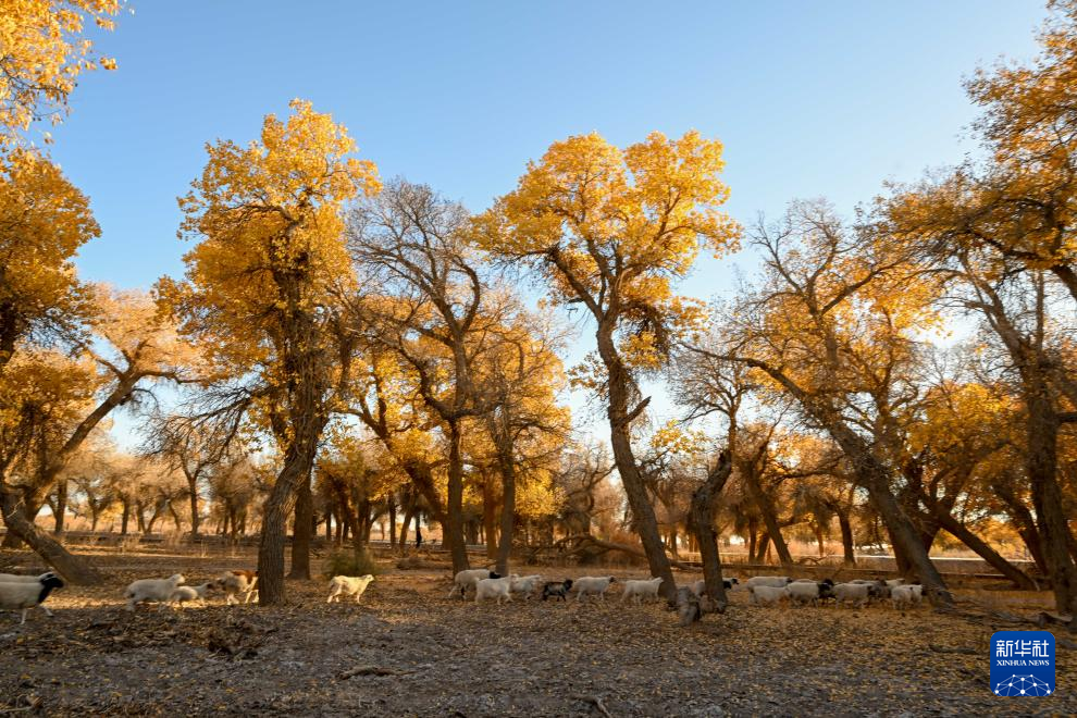 羊群在胡杨林里觅食。新华社记者 刘金海 摄