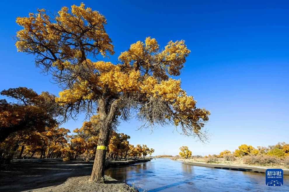 黑河岸边的胡杨林(10月24日摄)。新华社记者 刘金海 摄