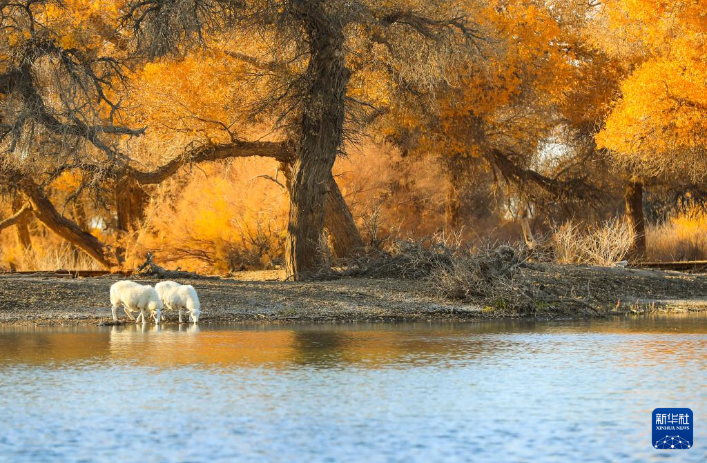 羊群在胡杨林前饮水。新华社记者 王楷焱 摄