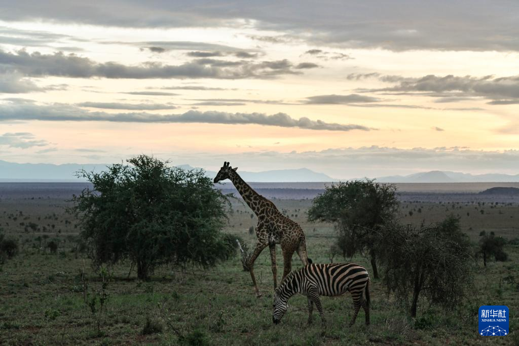 10月27日,长颈鹿、斑马在肯尼亚塔伊塔-塔韦塔郡泰塔山野生动物保护区内活动。