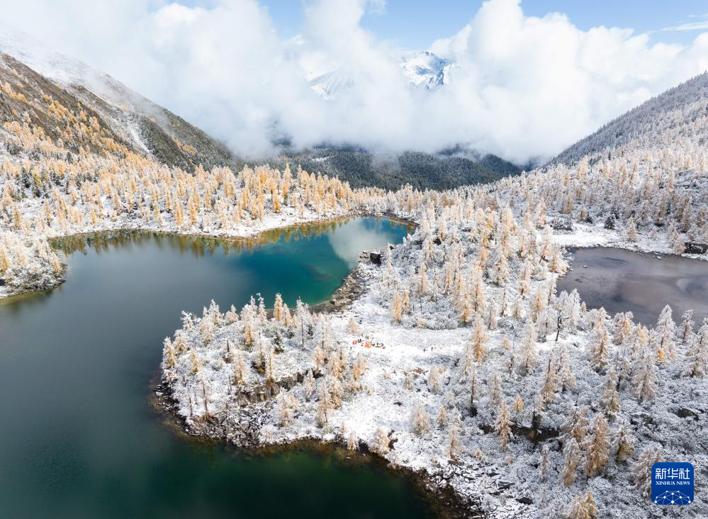 雪山、蓝天白云和党岭村葫芦海、彩林构成一幅优美的画卷(10月27日摄,无人机照片)。