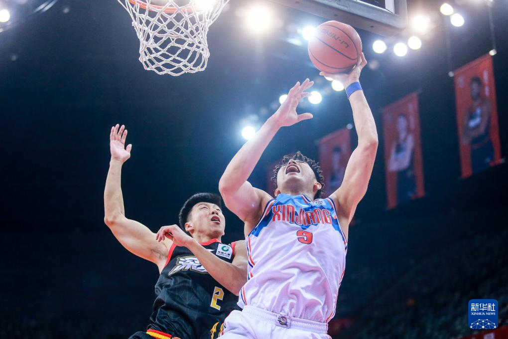 11月7日,新疆伊力特队球员吴冠希(右)在比赛中上篮。