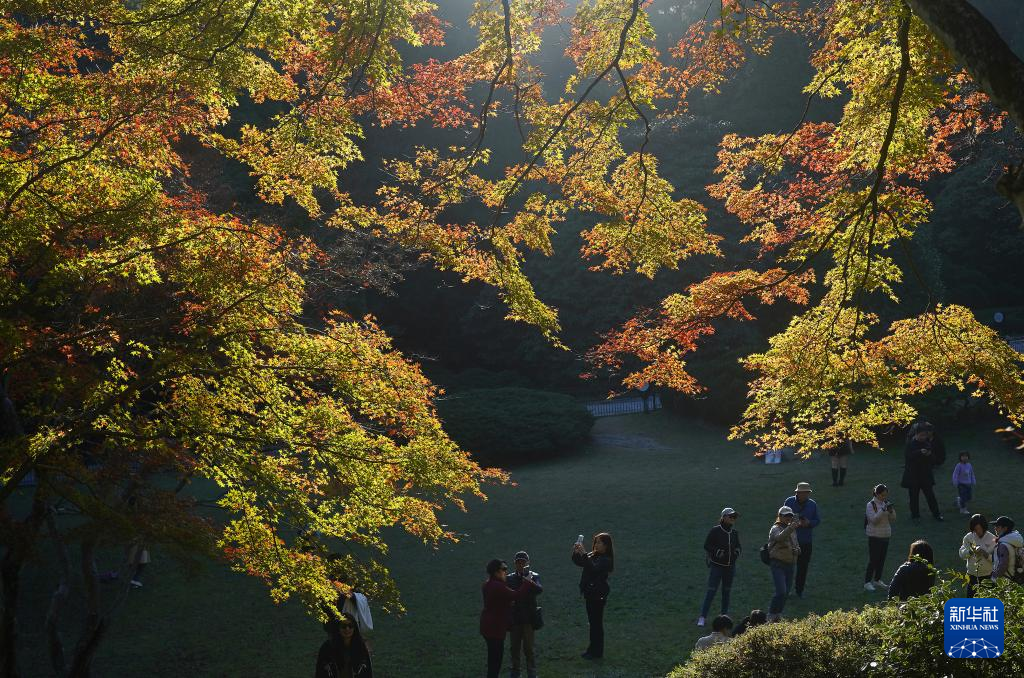 游人在庐山植物园观赏枫叶(11月18日摄)。
