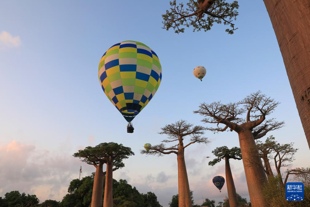 当日,在马达加斯加穆龙达瓦猴面包树大道,来自瑞士、法国等国的热气球旅行爱好者于日出时分乘坐热气球升空。猴面包树与热气球构成了一道独特的风景。
