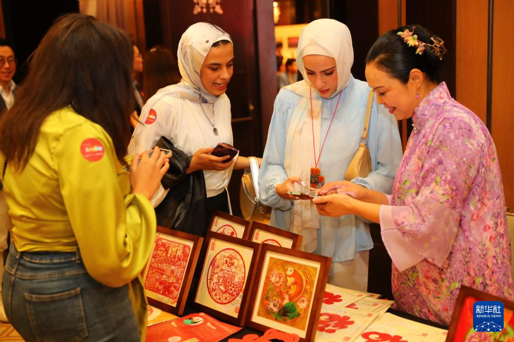 11月19日,在埃及开罗举行的粤港澳大湾区世界级旅游目的地推介暨“魅力广东”视觉展上,人们在非遗展区了解剪纸。