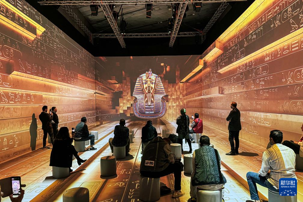 当日,图坦卡蒙沉浸式展览在大埃及博物馆开幕。观众可通过现场绚丽的视觉效果和配乐沉浸式了解法老图坦卡蒙的故事,以及古埃及的历史文化。