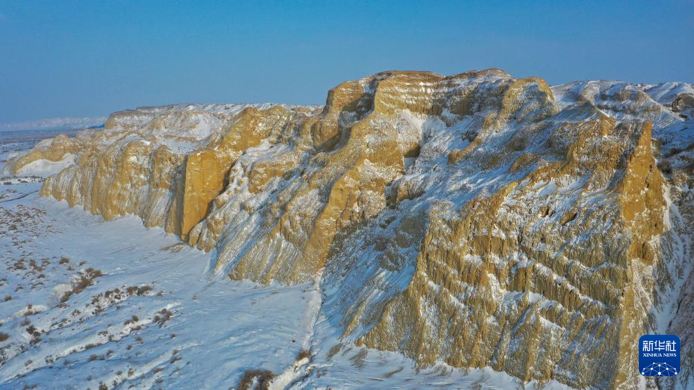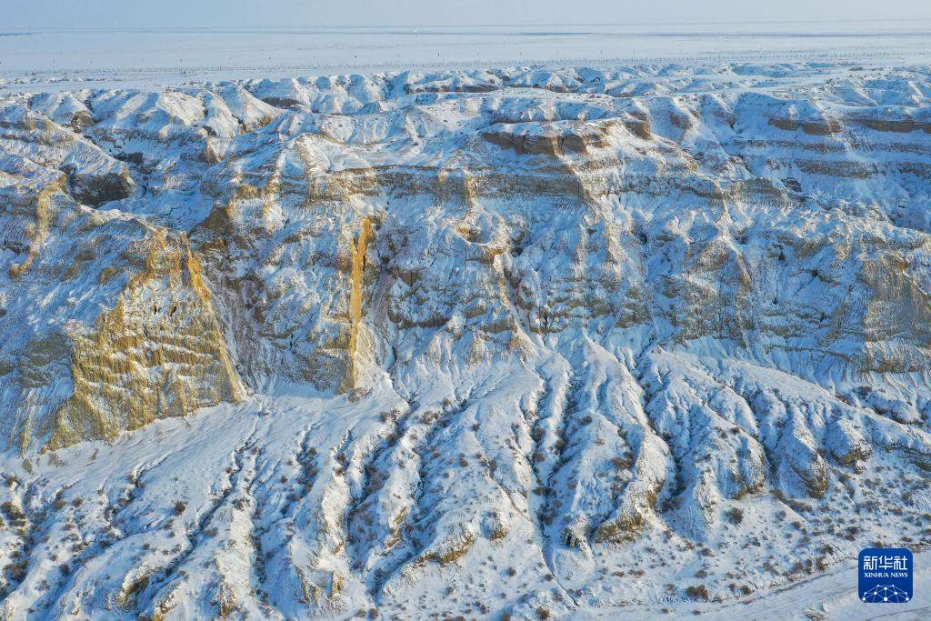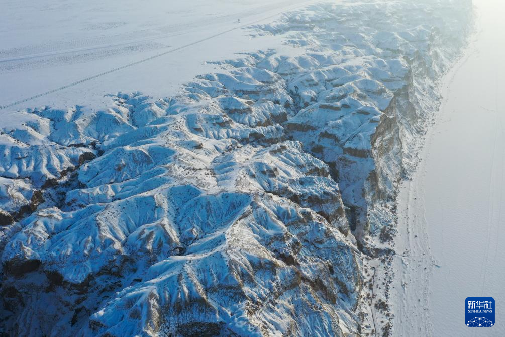 海上魔鬼城景区位于新疆阿勒泰地区福海县吉力湖东岸。冬日的海上魔鬼城银装素裹,错落有致的山体与皑皑白雪构成一幅壮丽的画卷。