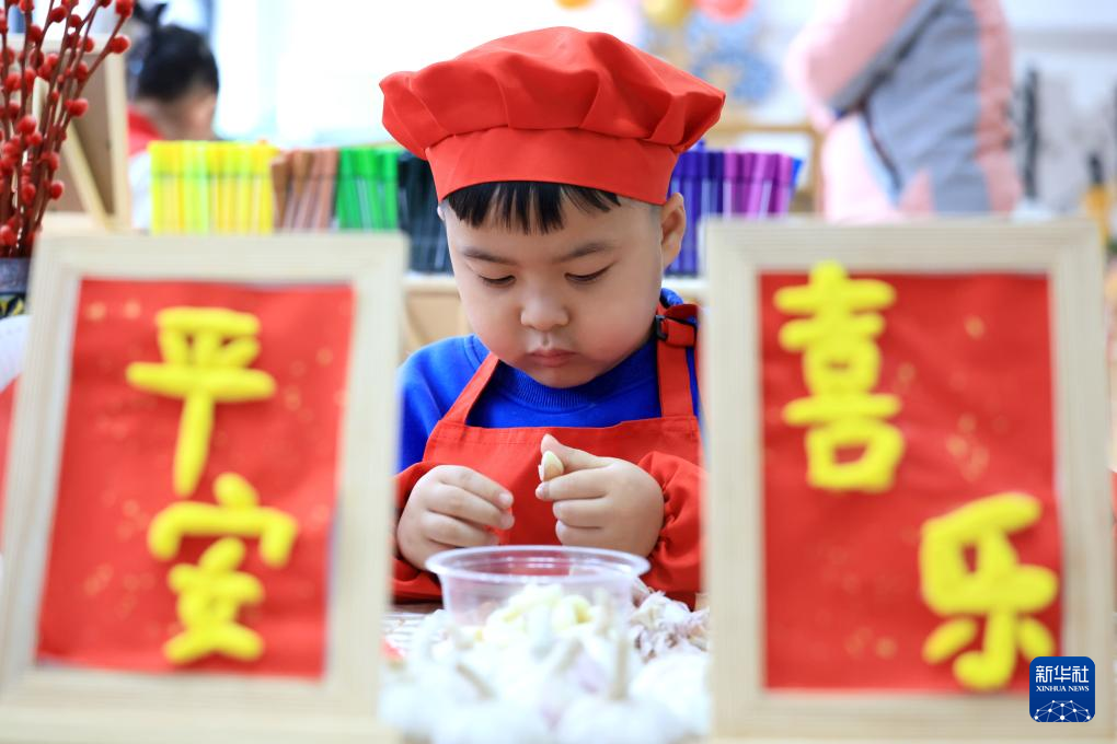 1月17日,河北省邢台市襄都区第六幼儿园的小朋友在老师的指导下制作腊八蒜。