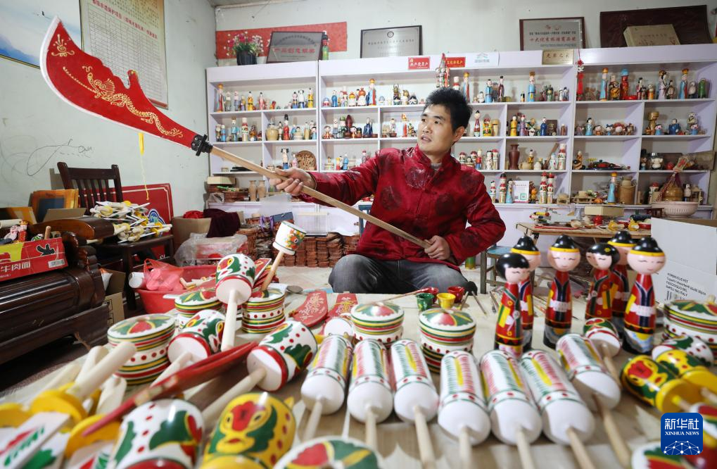 1月14日,山东省临沂市郯城县港上镇樊埝后村村民在展示木旋玩具“金龙刀”。