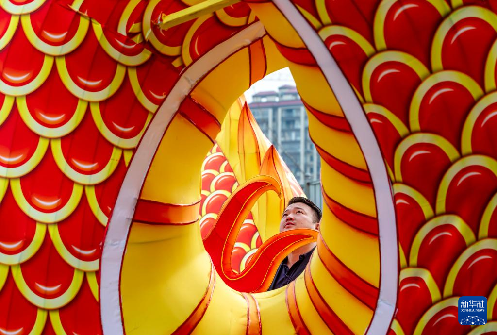 1月14日,工作人员在贵州省黔西市奥林匹克体育中心布置龙年新春灯会。