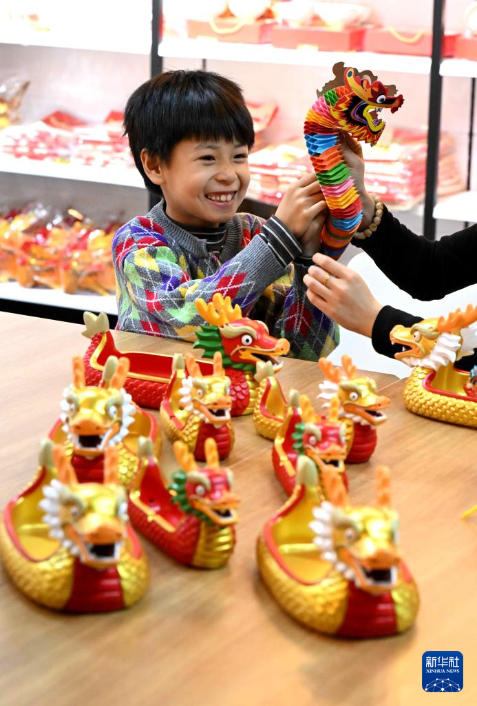 1月14日,小朋友在河北省石家庄市一家文创企业欣赏创意年货饰品。