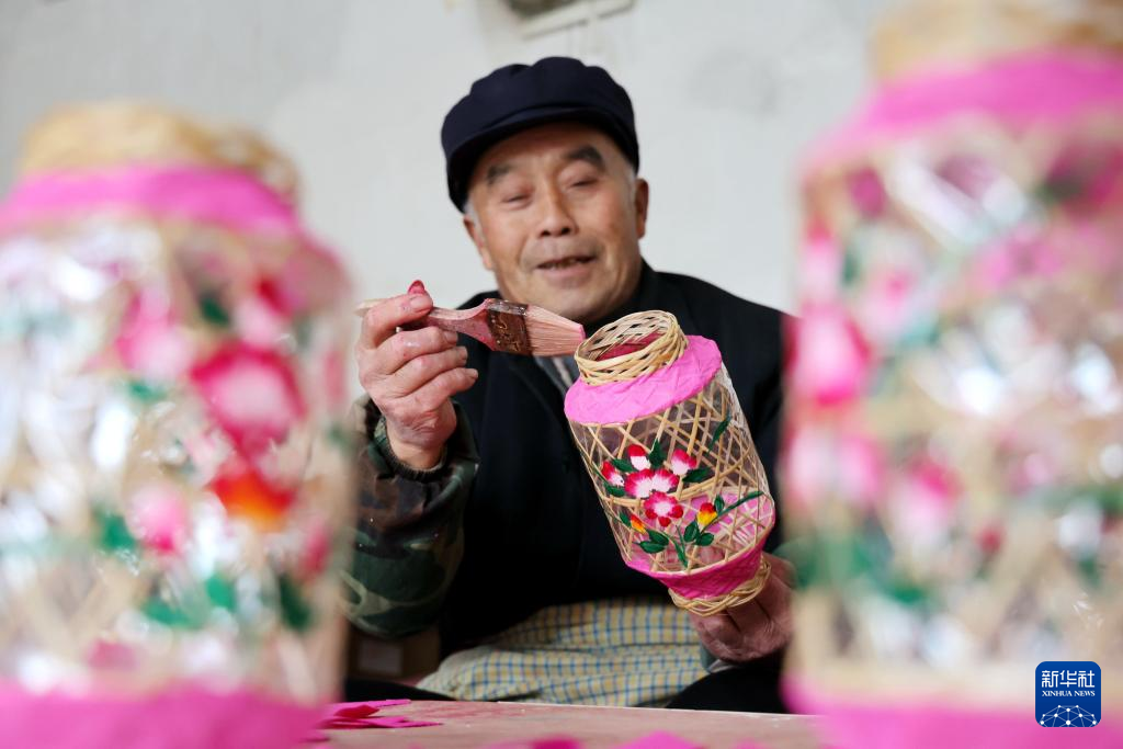 1月14日,山东省滨州市的手工艺人在用彩纸裱糊手扎灯笼。