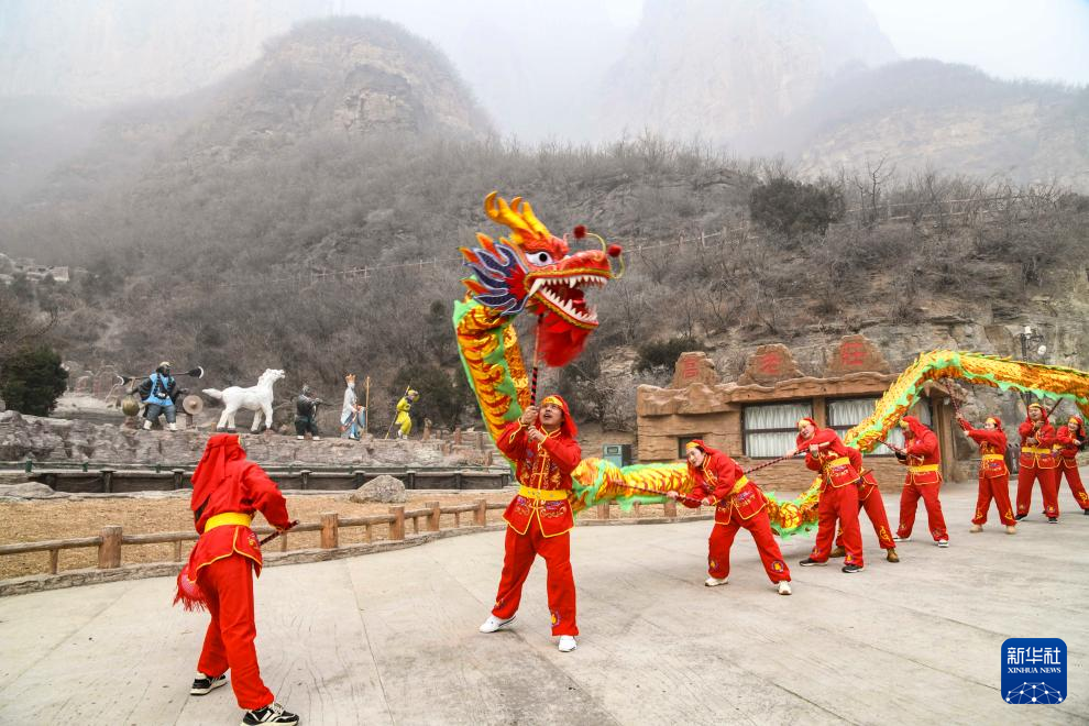 1月14日,河南省济源市五龙口景区工作人员在表演舞龙。