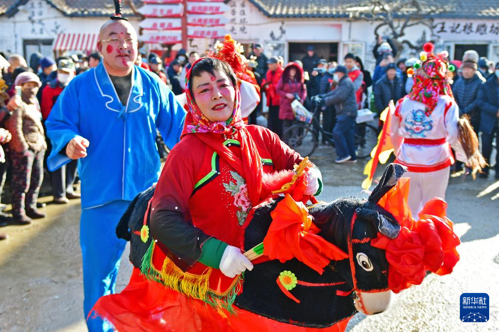 1月14日,民间艺人在山东省烟台市芝罘区东方文化市场表演当地民俗。