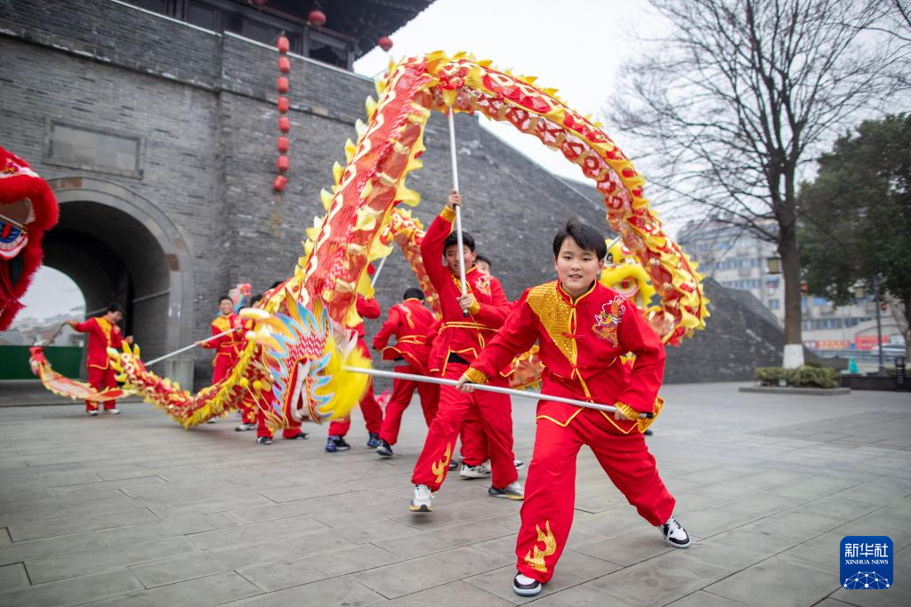 1月14日,在江苏省兴化市昭阳街道北门街区广场,新生中心小学的学生在练习舞龙。