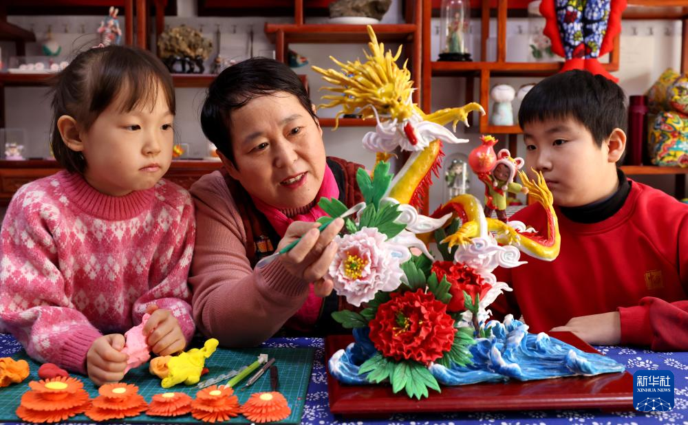 1月14日,山东省枣庄市龙山路街道的民间艺人在家中创作面塑作品。