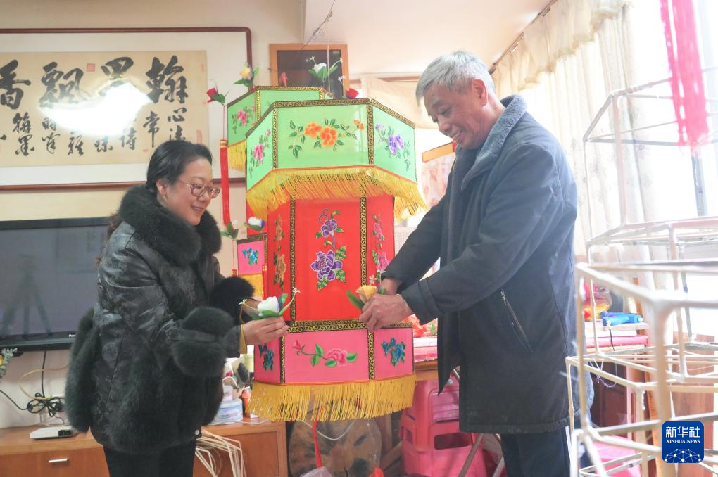 1月14日,福建省福州市非遗传承人杨瑞霖(右)在赶制传统手工花灯。