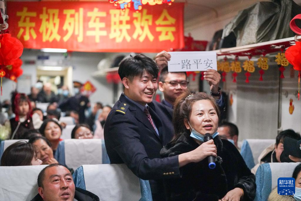 1月25日,列车工作人员在抚远开往哈尔滨的K7066次列车上与旅客进行“你猜我答”互动游戏。