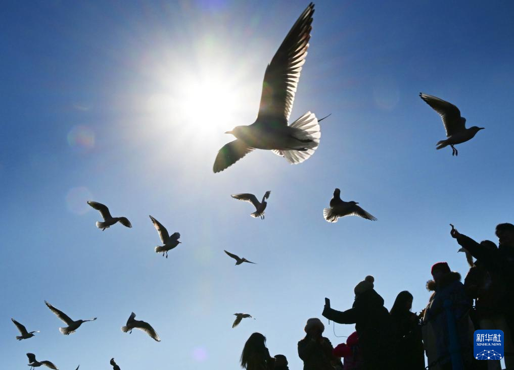 1月24日,游客在青岛市市南区栈桥景区观赏海鸥。