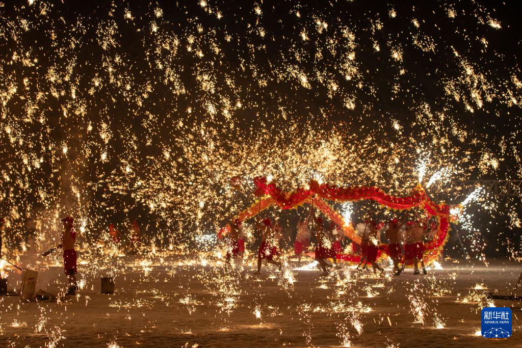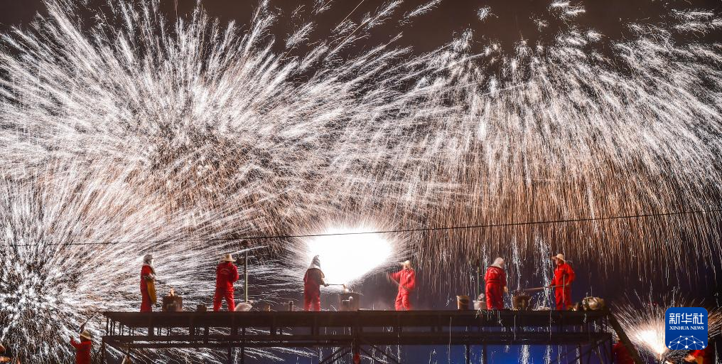 当晚,河南省洛阳市2024隋唐河洛文化庙会举行的非遗技艺打铁花表演现场火花飞溅,闪耀夜空,吸引游人驻足观赏。