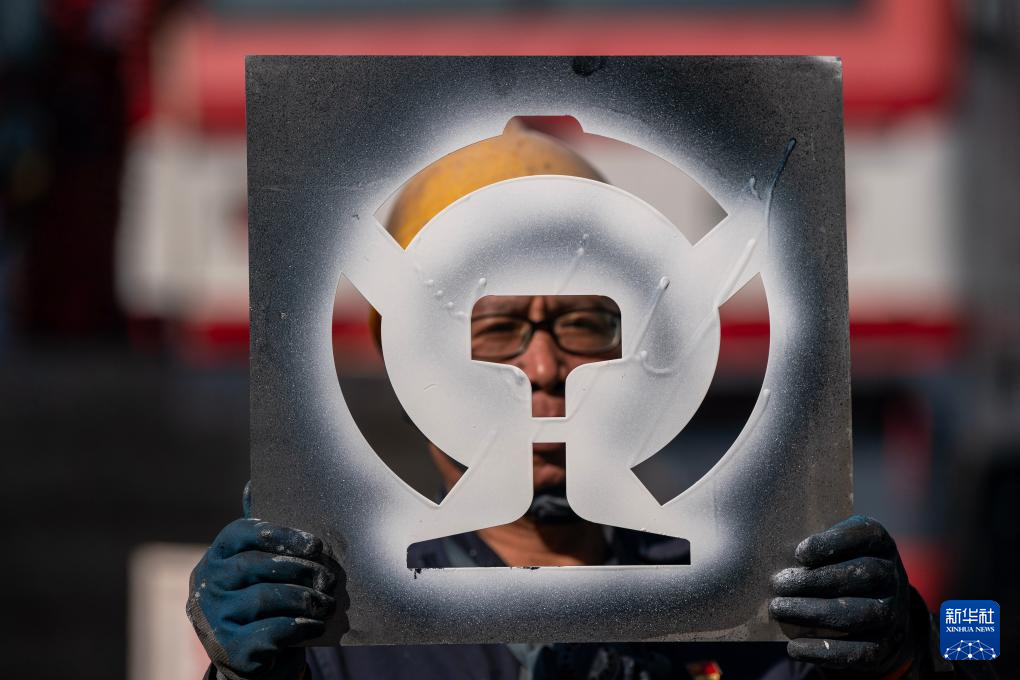 2月1日,张树红展示中国铁路标志的喷漆模板。