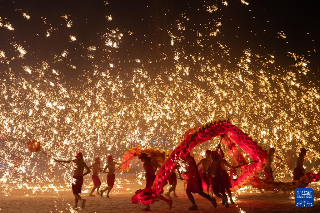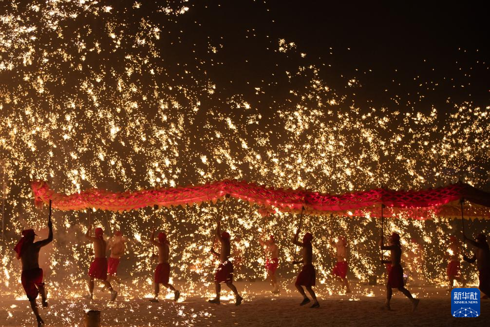 当晚,河南省洛阳市2024隋唐河洛文化庙会举行的非遗技艺打铁花表演现场火花飞溅,闪耀夜空,吸引游人驻足观赏。
