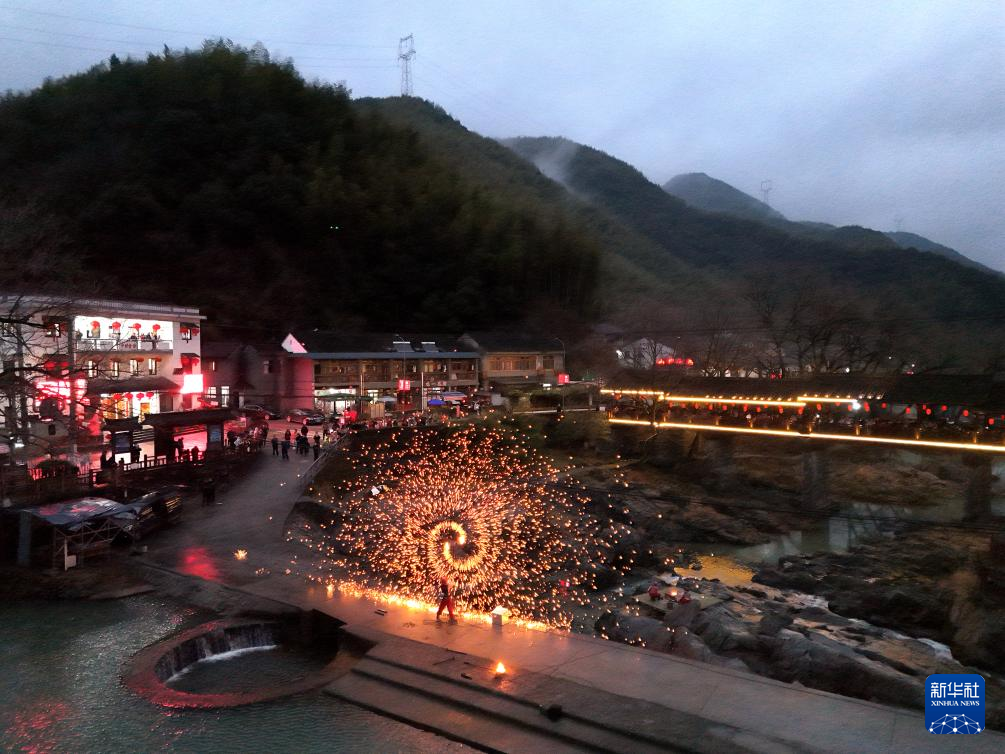 2月3日,在浙江省余姚市鹿亭乡中村村,民间艺人进行非遗打铁花表演。
