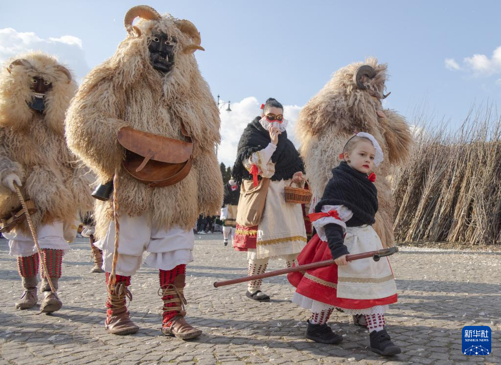2月13日,在匈牙利南部城市莫哈奇,人们参加一年一度的莫哈奇狂欢节游行活动。