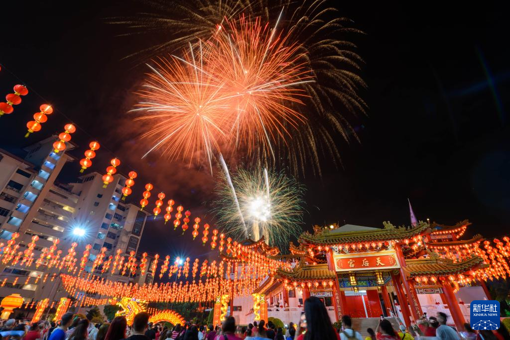 这是2月10日凌晨在马来西亚吉隆坡天后宫拍摄的烟花。