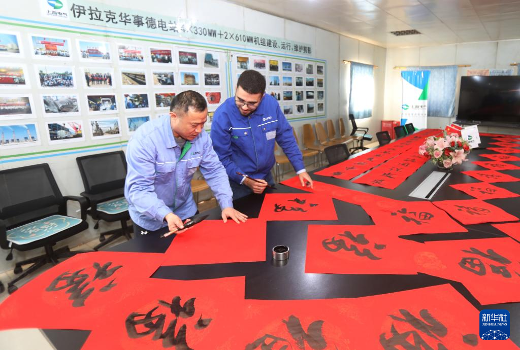 2月9日,在位于伊拉克瓦西特省的上海电气华事德电厂项目一线,伊拉克工程师学写春联,和中方员工共庆新春。