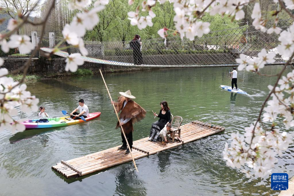 3月30日,游客在浙江省湖州市德清县莫干山镇佛堂村乘竹筏赏樱花。