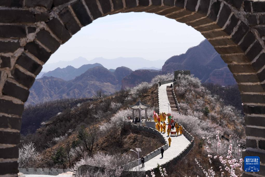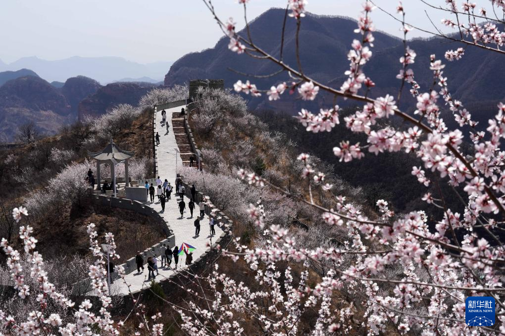 3月30日,游人在河北邢台九龙峡景区内赏花游览。