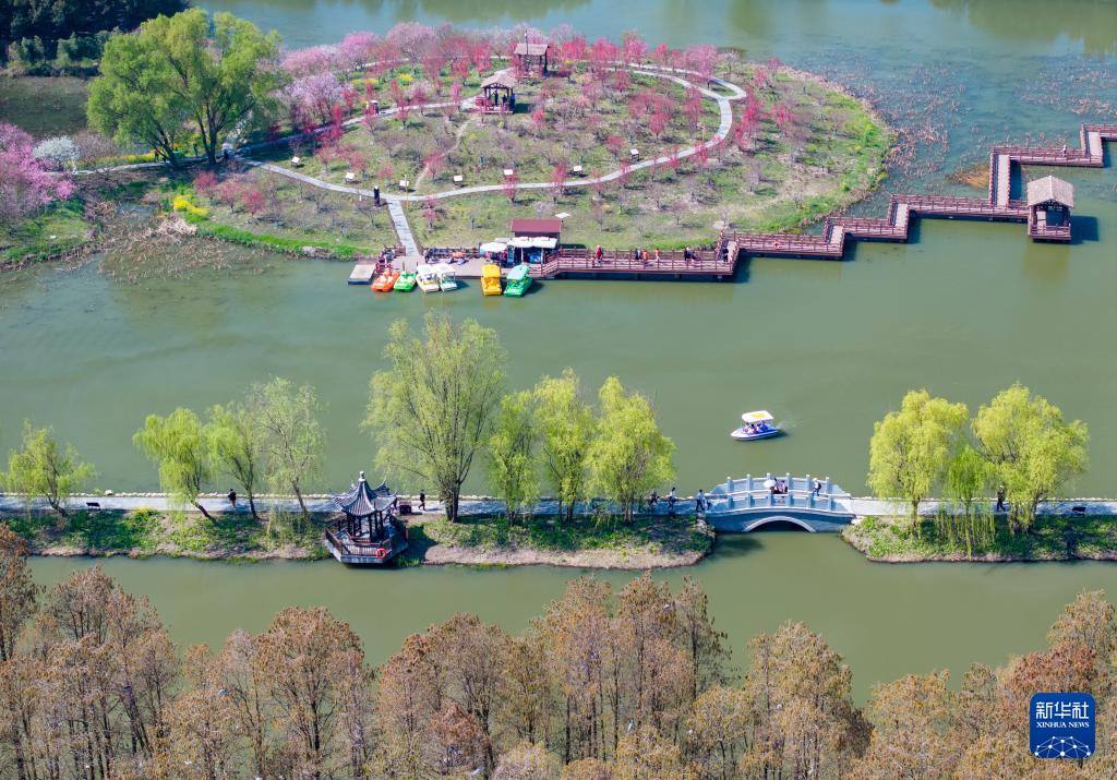 3月30日,游客在江苏省兴化市里下河国家湿地公园游玩(无人机照片)。