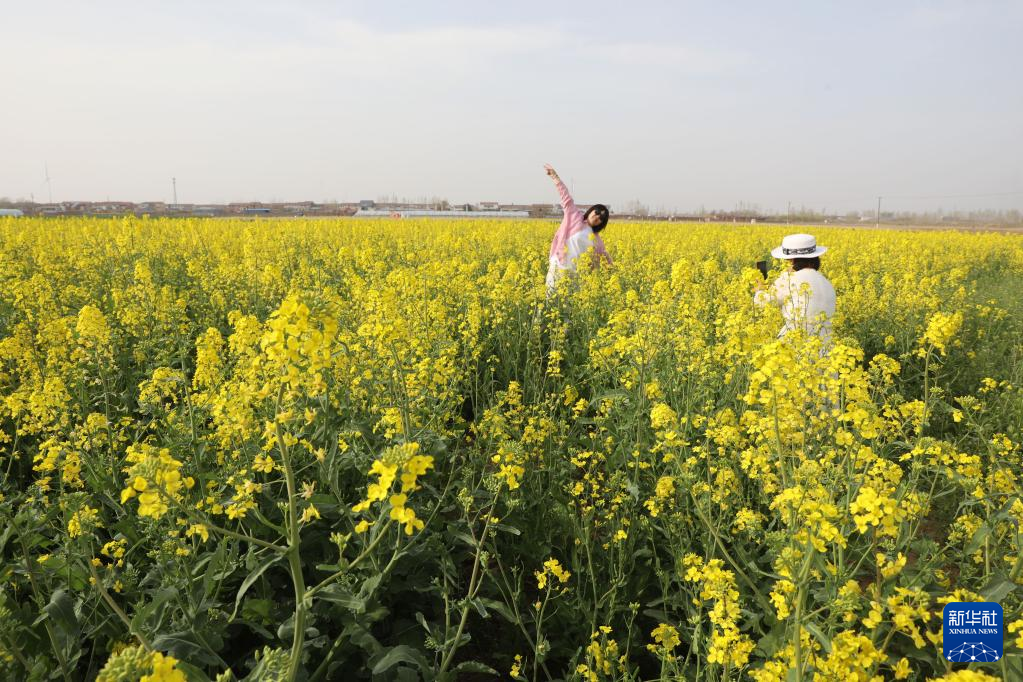 3月30日,游客在河南省焦作市温县黄河街道下石井村油菜花海赏花游玩。