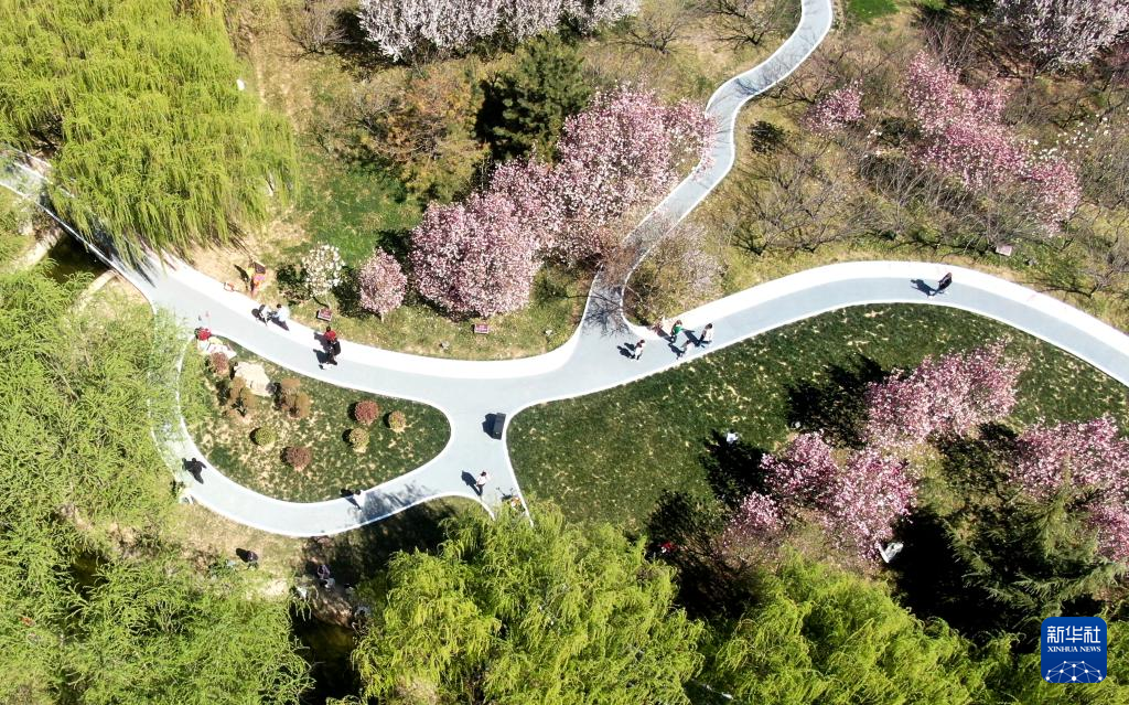 3月30日,游人在河北省石家庄市栾城区樱花公园游玩(无人机照片)。