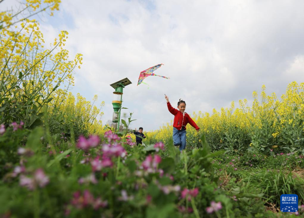 3月23日,小朋友在贵州省黔东南苗族侗族自治州施秉县城关镇上翁哨村油菜花田中放风筝。