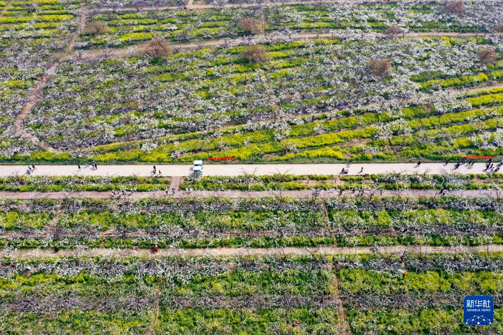 4月6日,游客在河北省晋州市周家庄农业特色观光园梨花观赏区游玩(无人机照片)。